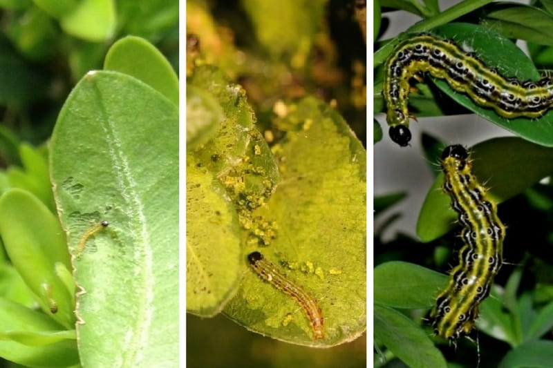 Les premiers signes d’une infestation de pyrales sont souvent les fils de soie autour des buis et les nombreuses déjections vert foncé autour des arbustes. Les chenilles se repèrent plus facilement dans les parties basses et le centre des plantes infestées.