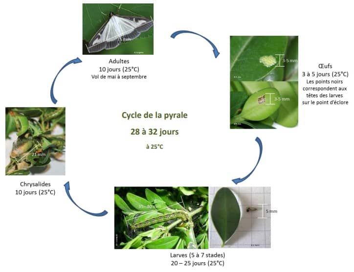 Cela permettra aux lecteurs de saisir rapidement les étapes clés du cycle de vie de la pyrale du buis et les périodes importantes pour la gestion de ce ravageur.
