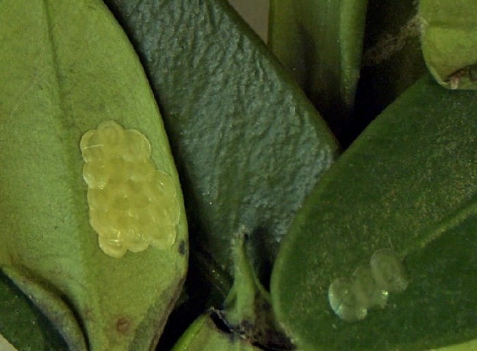 Les œufs sont d’aspect translucide, groupés en plaques et sont généralement pondus sur la face inférieure des feuilles. Ce qui les rend difficile à repérer. Il suffit de quelques jours pour voir apparaître les premières chenilles.