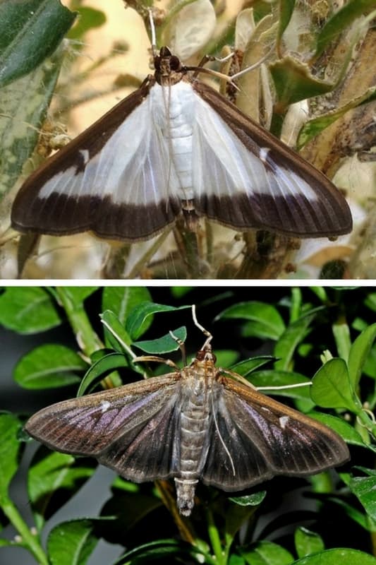 Ce sont des papillons nocturnes. Il existe deux formes de pyrales : l’une possède des ailes blanc nacré bordées d’une bande brune avec des irisations dorées et violacées. L’autre, plus rare, possède des ailes entièrement brunes. Les deux formes sont tout de même identifiable grâce à un petit croissant de lune blanc sur leurs ailes. Leur envergure se situe entre 35 et 44 mm. Une femelle vit environ 15 jours mais peut pondre des centaines d’œufs au cours de sa courte vie. Les papillons sont fortement attirés par la lumière et leur pullulation est aussi problématique… certaines habitations étant littéralement envahies.