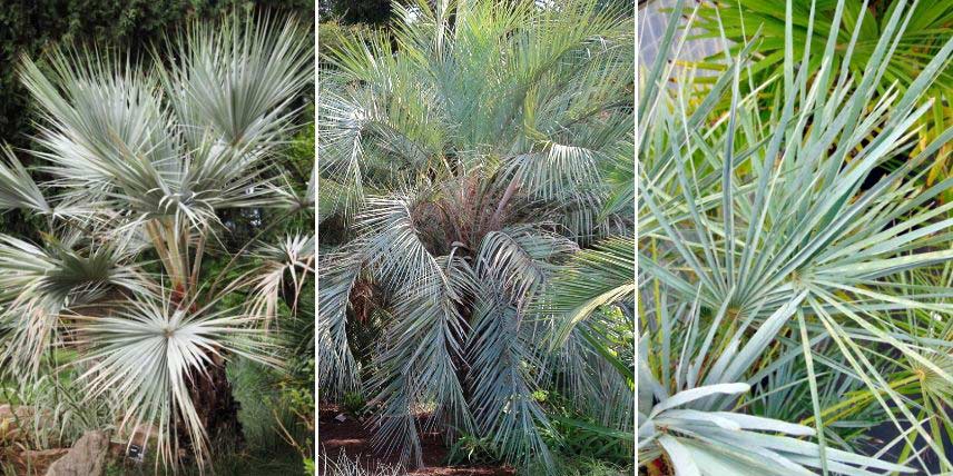 Le feuillage bleu argenté des Brahea armata, Butia capitata (photo cultivar413) et Chamaerops humilis ‘Cerifera’