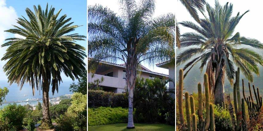 Certains palmiers deviennent particulièrement hauts et imposants ! Ici, Phoenix canariensis (photo Amanda Grobe), Syagrus romanzoffiana (photo Forest & Kim Starr) et Jubaea chilensis (photo Jorge Leon Cabello)