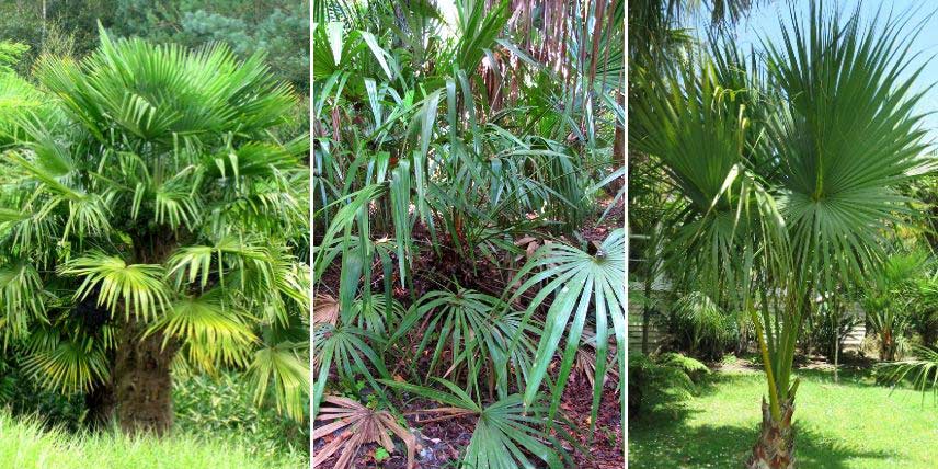 Trois palmiers qui s’adaptent bien aux situations ombragées : Rhapidophyllum hystrix (photo Homer Edward Price), Sabal minor (photo V.B. Williamson) et Trachycarpus fortunei (photo Georges Seguin)