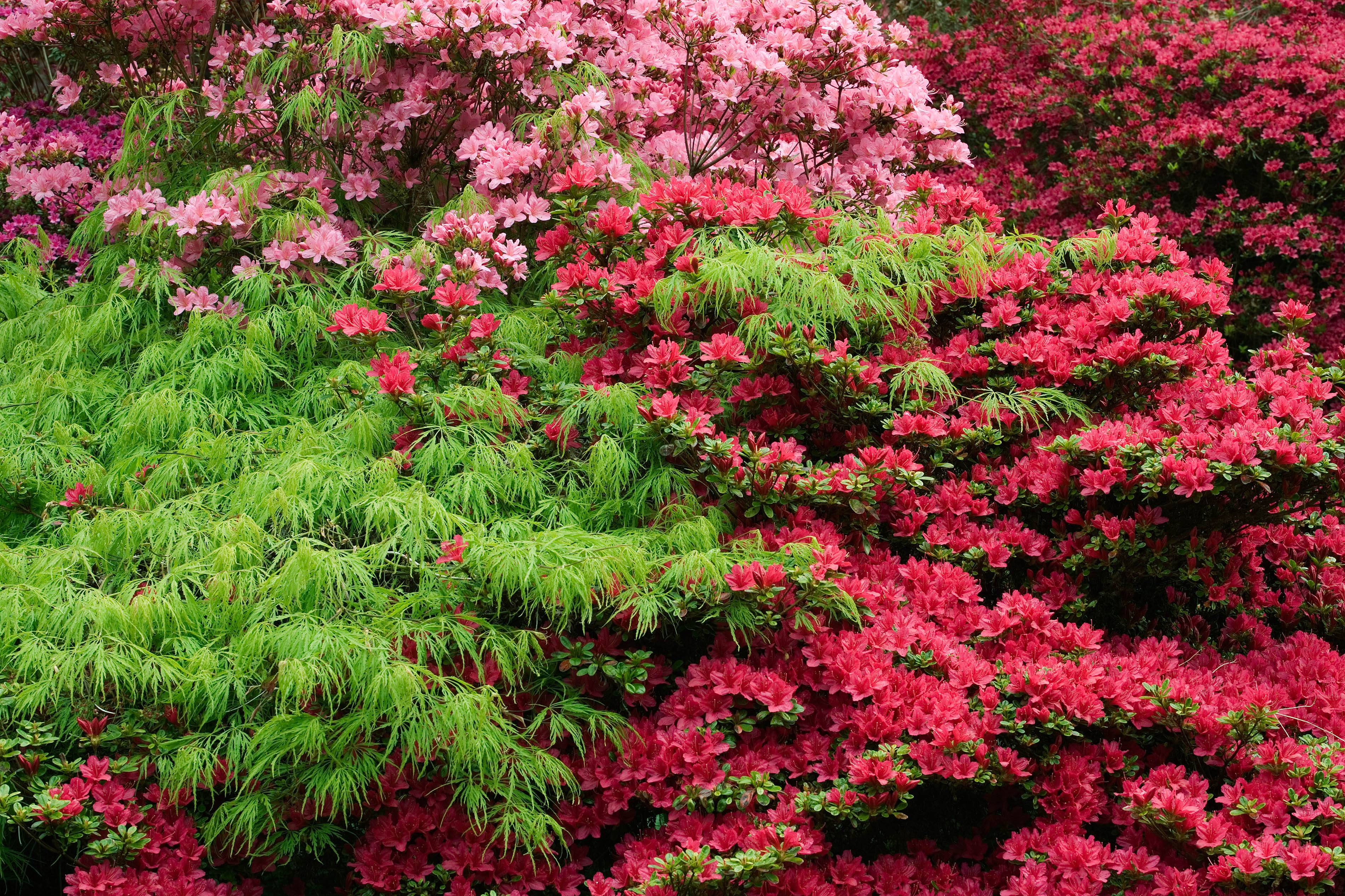 Acer palmatum et Rhododendrons au printemps