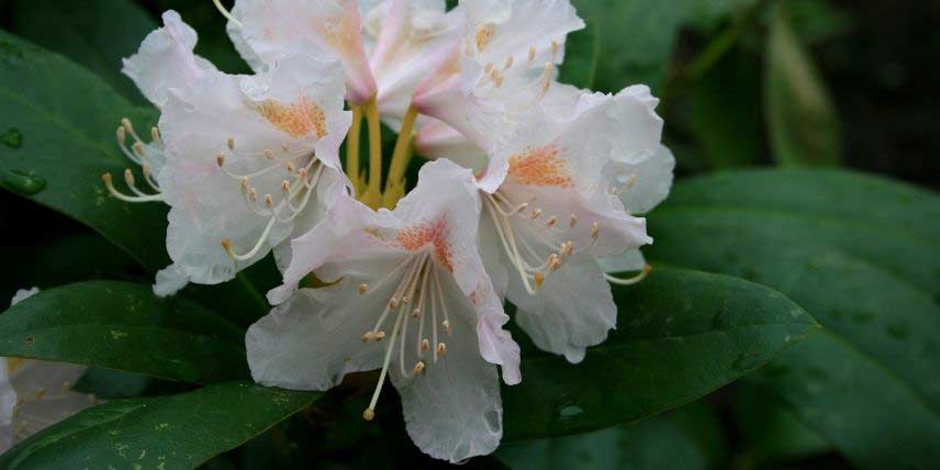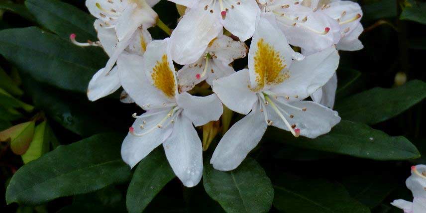 Au mois de mai, le rhododendron ‘Cunningham’s White’ offre de grandes fleurs, de couleur blanc pur, nuancées par le pétale supérieur piqueté de jaune. Les fleurs ont une forme évasée, en entonnoir, et mesurent 5-6 cm de longueur, avec le bord des pétales ondulé. Une floraison majestueuse et délicate, qui est parfois remontante en septembre. ‘Cunningham’s White’ forme un arbuste dense, d’abord dressé, puis s’étalant au fil du temps, pour atteindre à maturité jusqu’à 2 m de hauteur et d’envergure. Il supporte le soleil du moment que le sol reste frais.