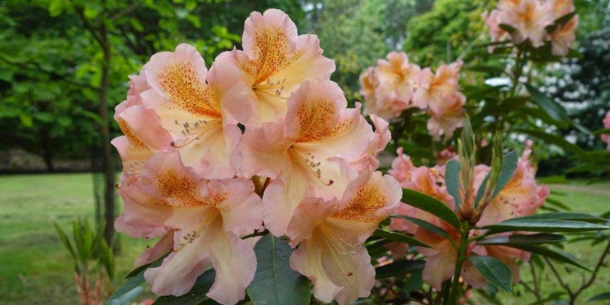 Chez le rhododendron ‘Horizon Monarch, les boutons floraux sont orangés et s’ouvrent pour dévoiler de grandes fleurs aux superbes nuances jaune crème – orangé. Le bord des pétales est joliment ondulé. La floraison est généreuse, avec des corymbes réunissant jusqu’à une quinzaine de fleurs. Leurs teintes pastel et harmonieuses ressortent à merveille sur le feuillage vert foncé et brillant. C’est un arbuste qui atteint jusqu’à 1,80 m de hauteur et d’envergure, et peut prendre avec le temps un port assez large et étalé.