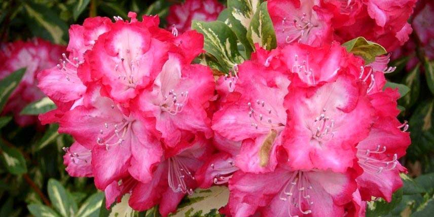 Le rhododendron ‘President Roosevelt’ dévoile dès le début du printemps (mars-avril), des fleurs blanc rosé au centre, et rose foncé sur l’extérieur, rassemblées en corymbes. On apprécie ce beau dégradé de teintes, qui attire l’attention. De plus, son feuillage est panaché, vert foncé sur l’extérieur du limbe, et marqué de taches jaunes irrégulières au centre. Les feuilles sont brillantes et mesurent entre 6 et 10 cm de longueur. Il est rustique jusqu’à – 12 °C, et forme un arbuste atteignant 1,20 à 1,50 m de hauteur, pour environ 1 m d’envergure.