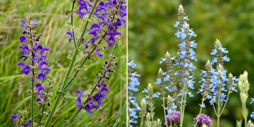 Avec près de 1000 espèces et de nombreuses variétés horticoles, les sauges constituent un groupe de plantes très diversifié. La Sauge officinale, appréciée en cuisine, est l’une des plus connues, mais il existe aussi une multitude de variétés ornementales qui s’intègrent facilement au jardin, dans des massifs de vivaces. Elles offrent en général des fleurs colorées (bleu, violet, blanc, rose, rouge, jaune…), rassemblées en épis, et un feuillage aromatique. La plupart se plaisent au soleil et en sol plutôt sec, bien qu’il existe aussi des variétés pour sol frais ou pour l’ombre.