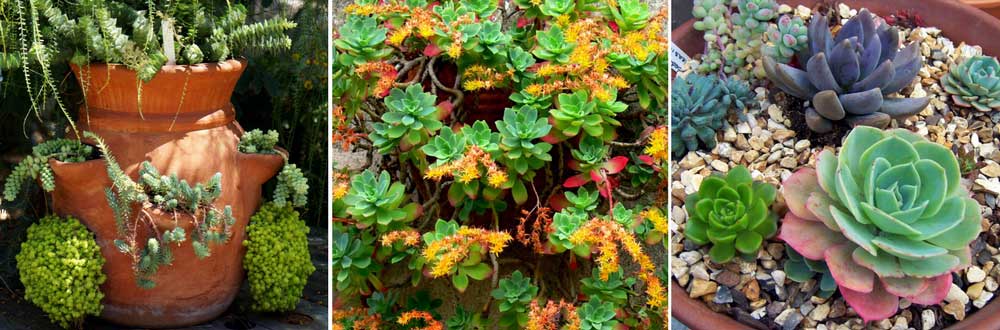 Vous pouvez réaliser des compositions en vasque en associant des echeverias et sédums, notamment Sedum palmeri (au centre, photo Wolfgang Sauber)