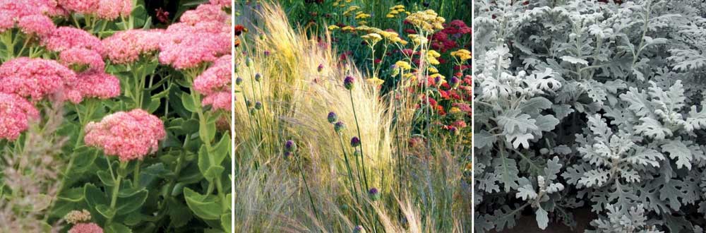 Choisissez des variétés hautes, comme le Sedum ‘Herbstfreude’, ou le Sedum ‘Matrona’ – une variante au feuillage pourpre – que vous planterez par groupe de 5 à 7 pieds. Vous pouvez placer devant eux quelques sédums tapissants, comme le Sedum kamstchaticum, à la belle floraison jaune très lumineuse qui ressortira parmi ces feuillages plus sombres. Positionnez quelques touffes de graminées de part et d’autre (Pennisetum ou Stipa). Elles apporteront de la légèreté et créeront un joli contraste face au feuillage et port plus massif des sédums.