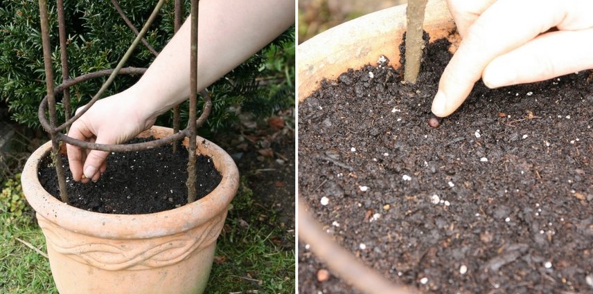 Semez vos graines, enfoncez-les de 2 ou 3 cm. Disposez tout de suite un armature qui permettra aux plantules de grimper.