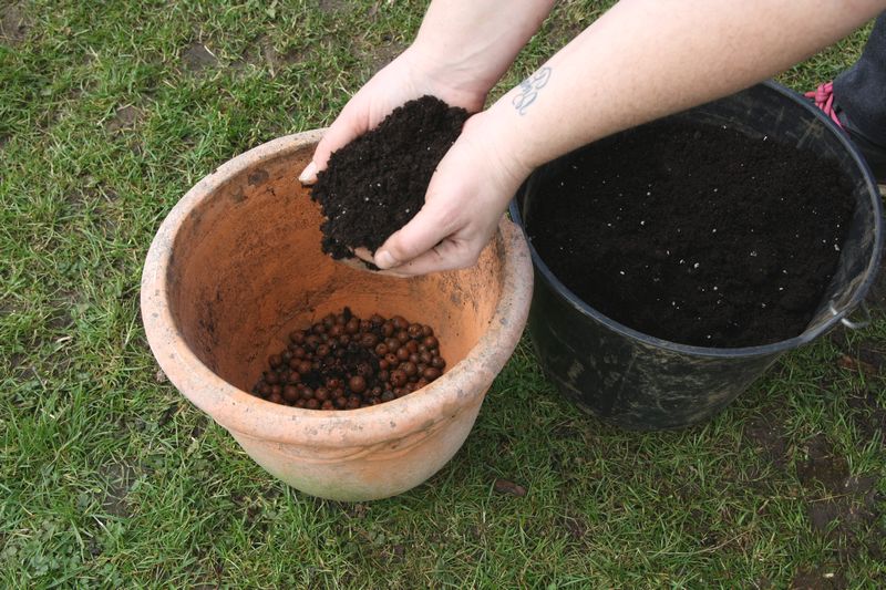 – Etape 2 : Complétez le pot d’un mélange pour moitié de terre du jardin et d’un bon terreau.