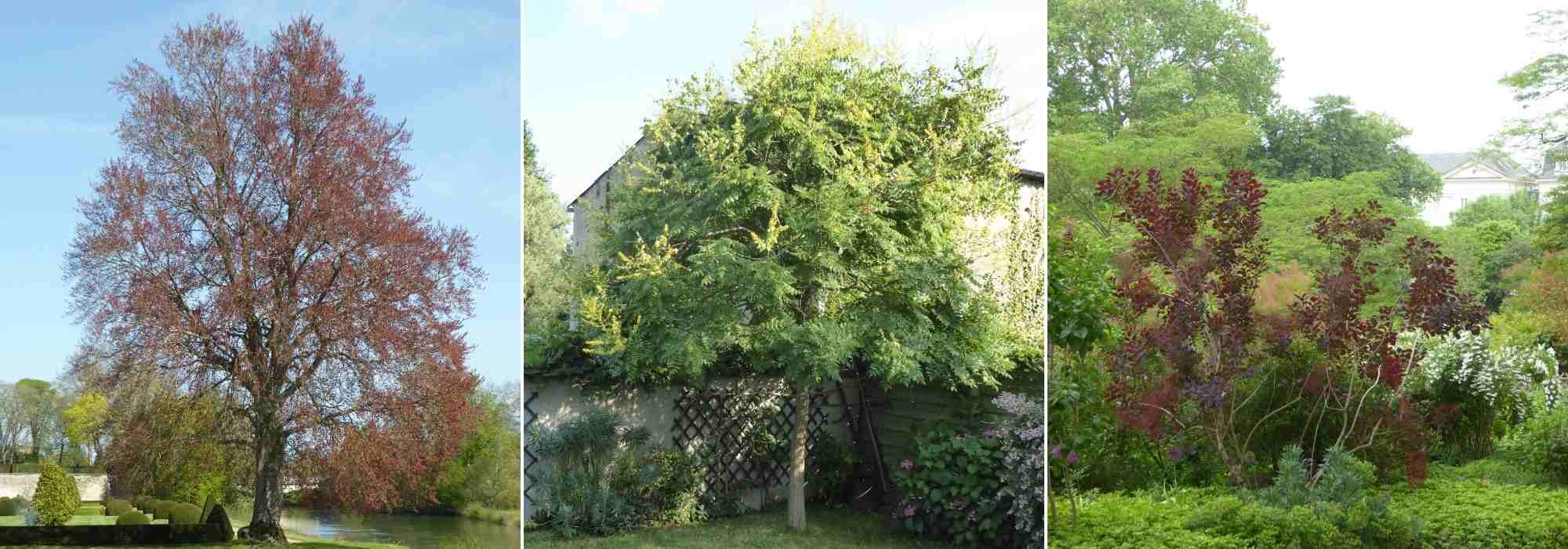 Un hêtre pourpre, un Savonnier et un Cotinus : trois hauteurs et ports distincts d’arbre, arbuste et arbrisseau, pour des espaces de taille différente (Photos : Gwenaëlle David)