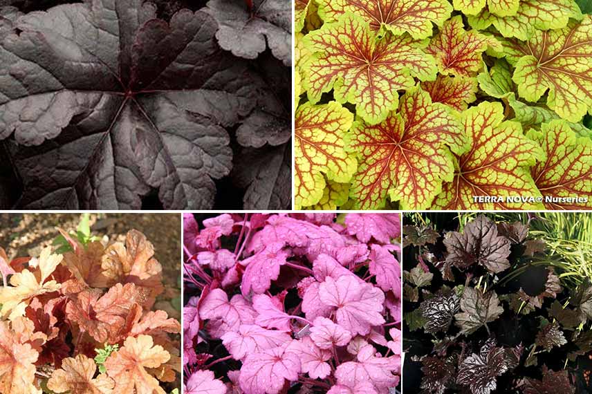 Mélangez l’heuchère ‘Georgia Plum’ au feuillage pourpre et rosé, ‘Blackout’ au feuillage noir, ‘Red Lightning’ au feuillage doré avec l’heucherella ‘Onyx’ au feuillage noir, ‘Honey Rose’ au feuillage rose veiné de pourpre afin de créer une mosaïque de feuillages plus étonnants les uns que les autres