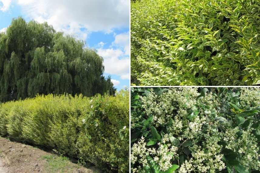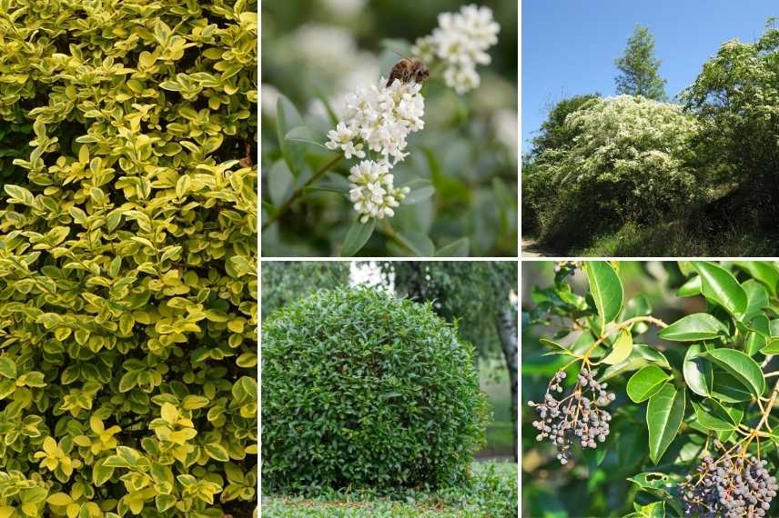 Pour cet usage spécifique, le troène de Californie (Ligustrum ovalifolium) ou le troène japonais (Ligustrum japonicum) sont tout indiqués avec leurs petites feuilles persistantes. On pourra également utiliser Ligustrum delavayanum.