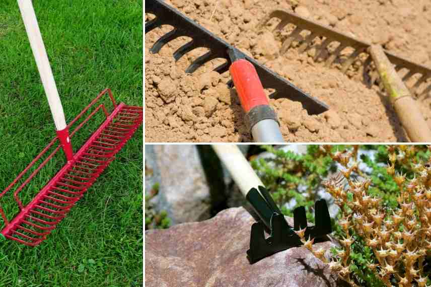 - Pour le potager et la réalisation de massifs et parterres : un râteau classique ou râteau à potager, encore appelé râteau traditionnel à dents droites ou légèrement recourbées.