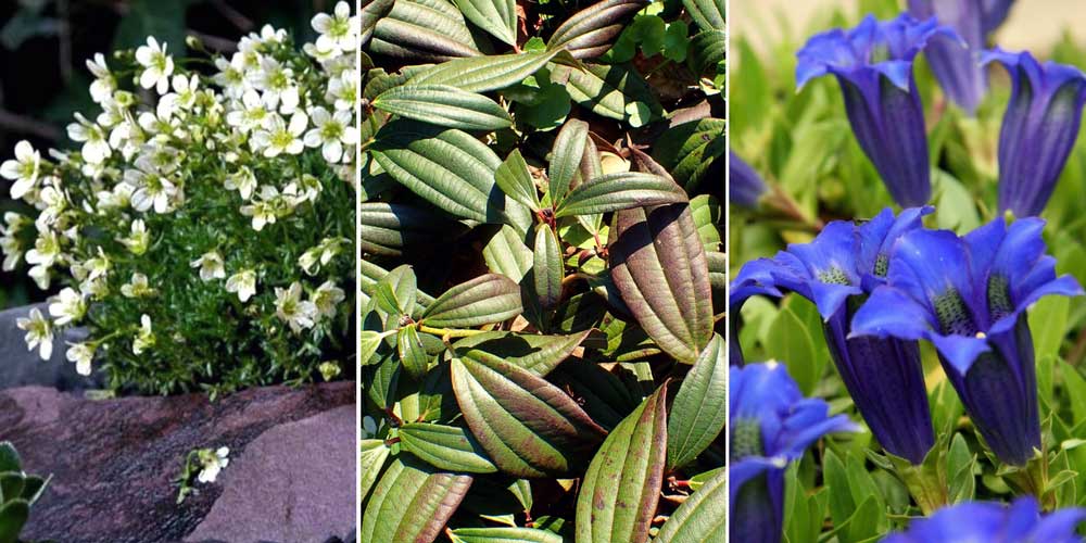 Le Viburnum davidii est l’espèce la plus adaptée pour constituer une rocaille ! Il a un port compact et étalé, peut s’utiliser en couvre-sol, est facile de culture et apprécie le soleil. Plantez-le en fond de massif accompagné par des conifères nains, comme le Thuya orientalis ‘Aurea Nana’ ou le Juniperus communis ‘Compressa’. Créez devant eux des tapis de fleurs avec l’Iberis sempervirens, Gentiana acaulis, Viola odorata ou des Saxifrages, que vous planterez par petits groupes. Dispersez dans le massif quelques touffes de graminées, ou, si l’emplacement est ombragé, quelques fougères comme la Scolopendre (Asplenium scolopendrium).