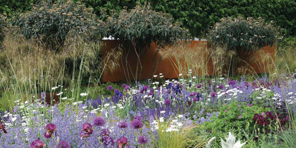 Les viburnums apportent du volume et composent un fond de massif qui se révèle précieux pour cacher un mur et créer un bel écran végétal. Pour cet usage, choisissez les variétés persistantes, comme le Viburnum tinus ‘Eve Price’. En été, avec leur feuillage assez classique, les viornes sont neutres et n’estomperont pas les couleurs éclatantes des fleurs que vous pourrez installer à leurs pieds. Et, pour le printemps, vous pouvez accompagner leur floraison par des bulbes printaniers et des vivaces : Tulipes, Muguet, Iberis, Brunnera macrophylla… Plantez-les en grand nombre, devant les viornes, pour composer un véritable tapis de fleurs à leurs pieds.