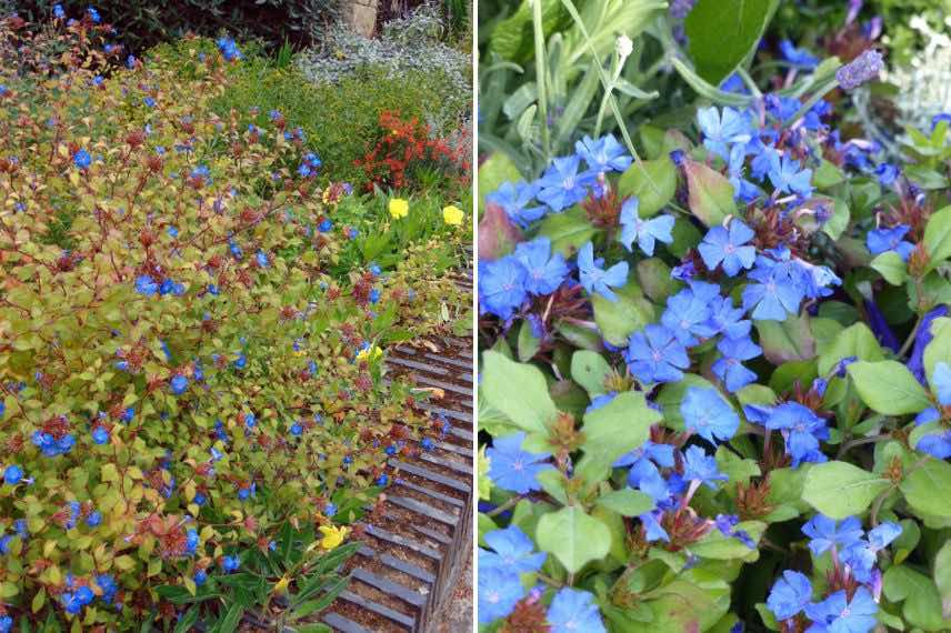 Le Ceratostigma plumbaginoïdes est une vivace couvre-sol qui ne craint ni la chaleur, ni le sec, ni le froid. Bien que sa végétation sèche en hiver, sa partie souterraine résiste à environ -15°C et repart une fois le printemps avancé. De croissance rapide, cette vivace s’étend par ses rhizomes jusqu’à former un tapis haut d’une trentaine de centimètres. Le Plumbago est décoratif grâce à son petit feuillage dont le vert tourne dès septembre au rouge vif à rose framboise, offrant un contraste saisissant à ses fleurs bleues qui couvrent la plante en été et une partie de l’automne. En sol riche, c’est une vivace qui peut prendre ses aises, mais se contrôle très facilement. Un sol pauvre, maigre et même sableux ne l’effraie cependant pas. Offrez-lui une exposition ensoleillée, en sol drainé, même calcaire. C’est une excellente plante, résistante et solide, belle une bonne partie de l’année.