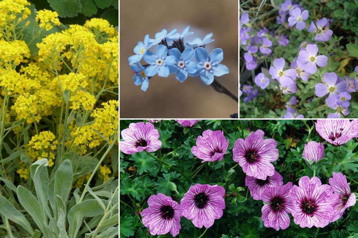 Une idée d’association en rocaille ou sur un muret : Alyssum saxatile (‘Goldkugel’ par exemple), Myosotis, Aubrieta ‘Cascade Blue’ et Geranium cinereum ‘Ballerina’