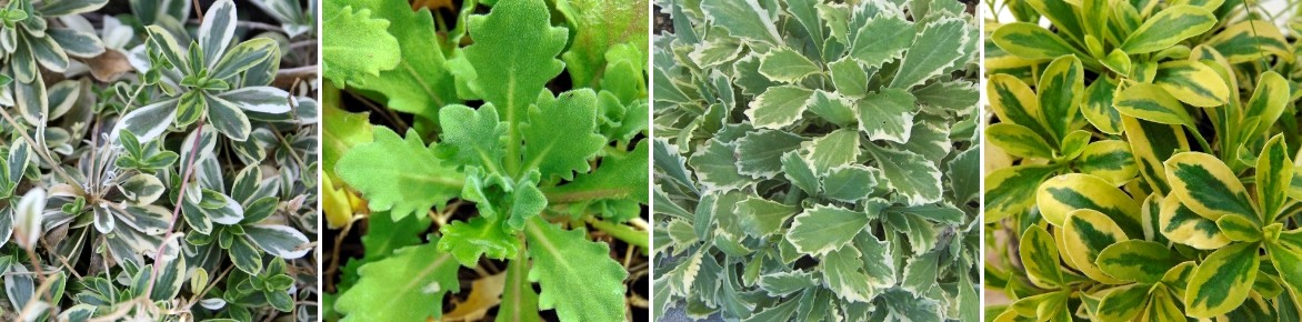 Quelques feuillages d’Arabis : Arabis ferdinandi coburgii ‘Variegata, Arabis caucasia ‘Pinkie’, Arabis alpina ssp caucasica ‘Variegata’, Arabis ferdinandi coburgii ‘Old Gold’