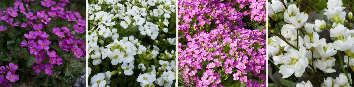 Quelques fleurs d’Arabis : A. caucasica ‘Pinkie’, A. caucasica ‘Snowcap’, A. alpina subsp. caucasica ‘Roselite’ et A. caucasica ‘Plena’