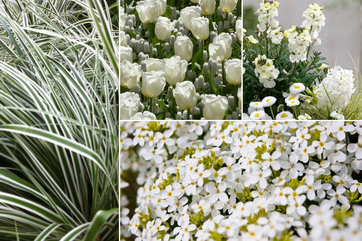 Une idée d’association en bordure de massif : Carex oshimensis ‘Everest’, Tulipe Triomphe ‘Calgary’, Bellis perennis blanc, Erysinum blanc, Jacinthe ‘Madame Sophie’ et Arabis caucasica comme ‘Snowcap’ (photo Jan Sølve Borlaug)