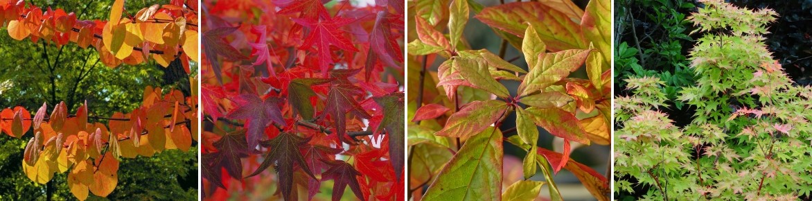 Un exemple d’association automnale : Cercidiphyllum japonicum, Liquidambar styraciflua ‘Worplesdon’, Nyssa sylvatica et Acer palmatum ‘Senkaki’ (‘Sangokaku’)