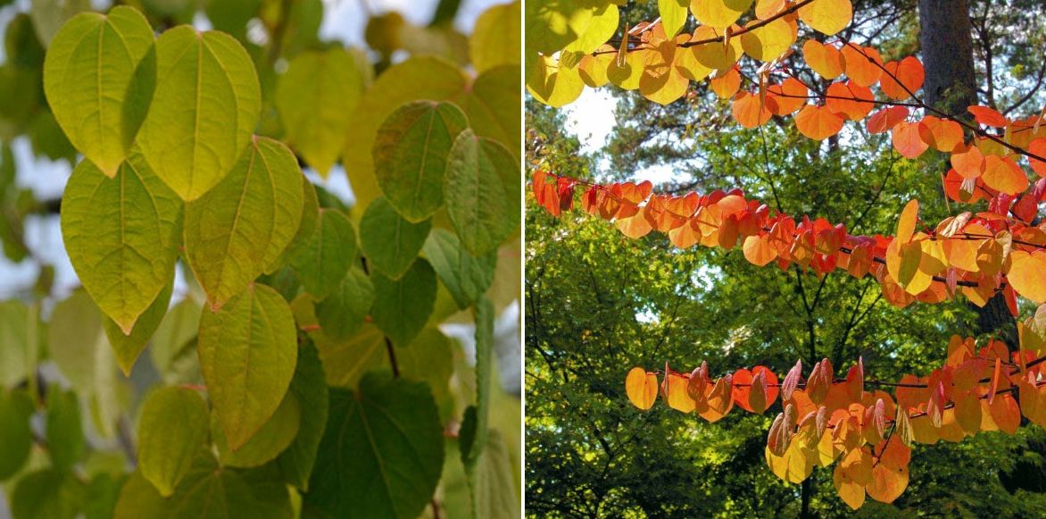 - Ses petites feuilles cordiformes rappelant celles de l’arbre de Judée, déclinent de douces pourprées au printemps, virant peu à peu au vert bleuté en été, avant le flamboiement automnal.