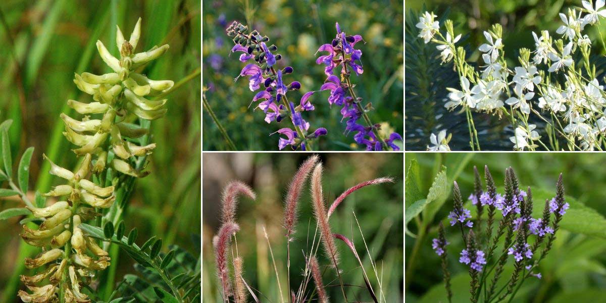 Astragalus canadensis (photo Joshua Mayer), Salvia pratensis (photo Roman Eisele), Gaura lindheimeri ‘Snowbird’, Pennisetum setaceum, et Verbena hastata (photo Cody Hough)