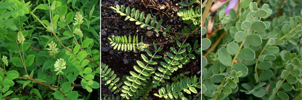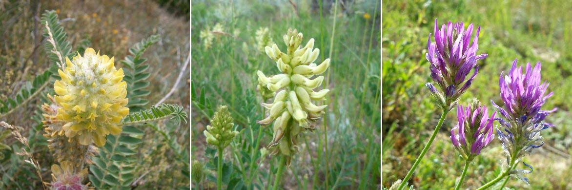 La floraison des astragales : dans l’ordre, Astragalus centralpinus (photo Meneerke Bloem), Astragalus canadensis (photo Matt Lavin), et Astragalus onobrychis (photo Stefan Lefnaer)