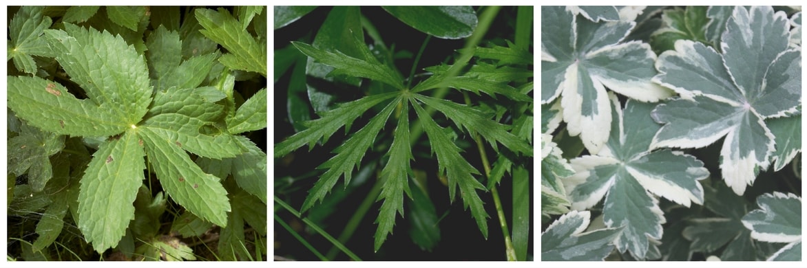 Différents feuillages d’astrance. De gauche à droite, Astrantia major, Astrantia minor, Astrantia Sunningdale Variegated.