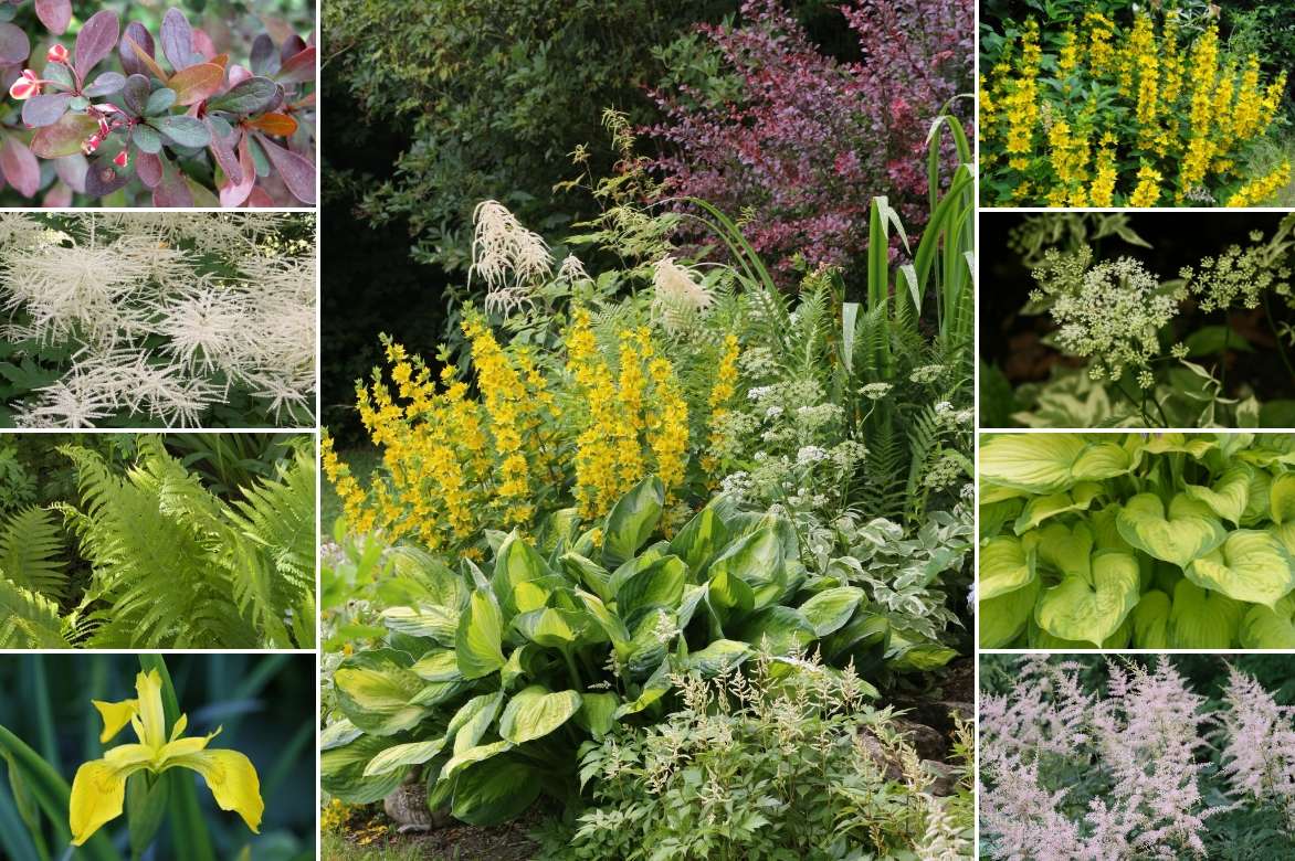 Un exemple d’association à mi-ombre : Berberis thunbergii, Aruncus dioïcus ‘Sylvestris’, Dryopteris filix-mas, Iris pseudacorus, Lysimachia punctata, Aegopodium podagraria ‘Variegata’, Hosta ‘Old Glory’, Astilbe simplicifolia ‘Hennie Graafland’