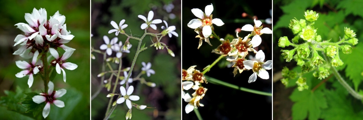 Les fleurs des Boykinia richardsonii, Boykinia occidentalis, Boykinia major et Boykinia lycoctonifolia (photos : Denali National Park and Preserve / Walter Siegmund / Tom Hilton / Qwert1234)