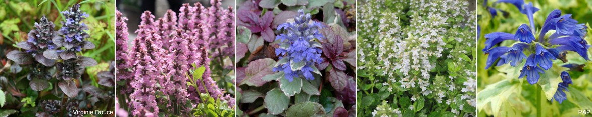 Les bugles présentent plusieurs couleurs : Ajuga reptans ‘Black Scallop’, Ajuga reptans Purple Torch, Ajuga reptans’ Burgundy Glow’, Ajuga reptans ‘Sanne’, Ajuga incisa ‘Frosted Jade’.