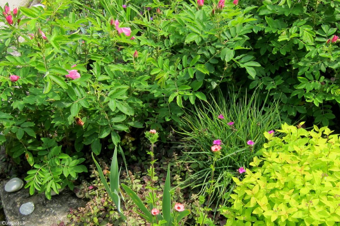 Un exemple d’association : Rosa rugosa ‘Monte Rosa’, Potentilla ‘Hopwoodiana’, Tradescantia ‘Satin Doll’, Spiraea ‘Lemon Queen’, Ajuga reptans ‘Renick’ (une variété proche de l’Ajuga ‘Atropurpurea’).