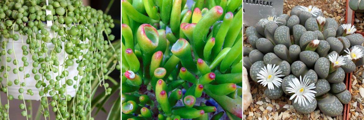 Les plantes grasses offrent une diversité exceptionnelle ! Senecio rowleyanus (photo Maja Dumat), Crassula ovata Gollum et Lithops marmorata (photo Abu Shawka)