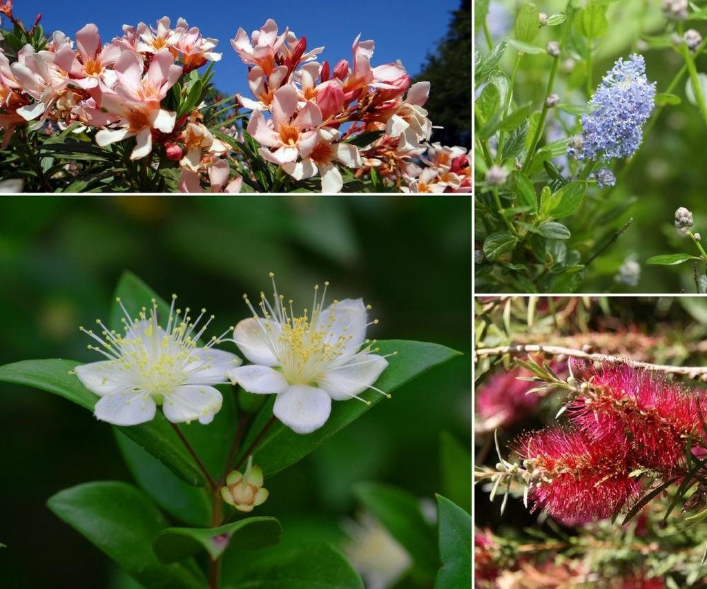 Un exemple d’association en haie persistante : Nerium oleander – Ceanothus ‘Skylark’ – Myrtus communis – Callistemon viminalis