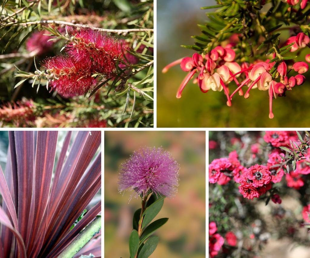Un exemple d’association exotique : Callistemon viminalis– Grevillea rosmarinifolia – Phormium – Melaleuca gibbosa et Leptospermum scoparium ‘Red Damask’.