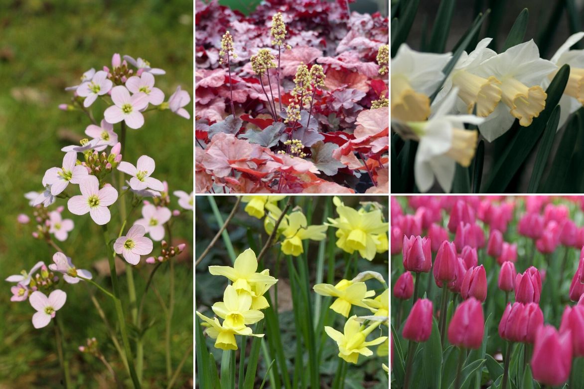 Un exemple d’association printanière : Cardamine pratensis, Heuchère ‘Little Cutie Blondie’, Narcisses ‘Salomé’ et ‘Stint’, Tulipe hâtive ‘Christmas Dream’