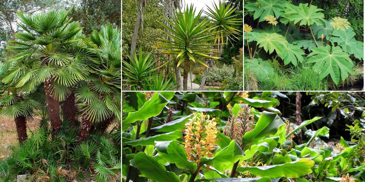 Chamaerops humilis (photo H. Zell), Yucca aloifolia (photo Stan Shebs), Tetrapanax papyrifera ‘Rex’, et Hedychium gardnerianum (photo Forest and Kim Starr)
