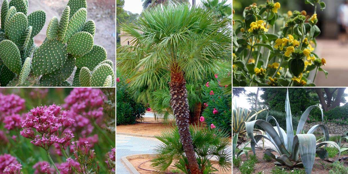Opuntia microdasys (photo Stan Shebs), Centranthus ruber (photo CaptainMish), Chamaerops humilis, Phlomis fruticosa, et Agave americana (photo Moreau Henri)