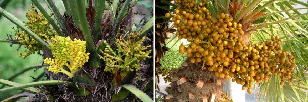 Le Chamaerops est en général dioïque : on trouve des pieds mâles, avec uniquement des fleurs mâles, et des pieds femelles (avec uniquement des fleurs femelles). Il existe aussi des Chamaerops monoïques, qui portent à la fois des organes mâles (étamines) et femelles (pistil) sur le même plant.