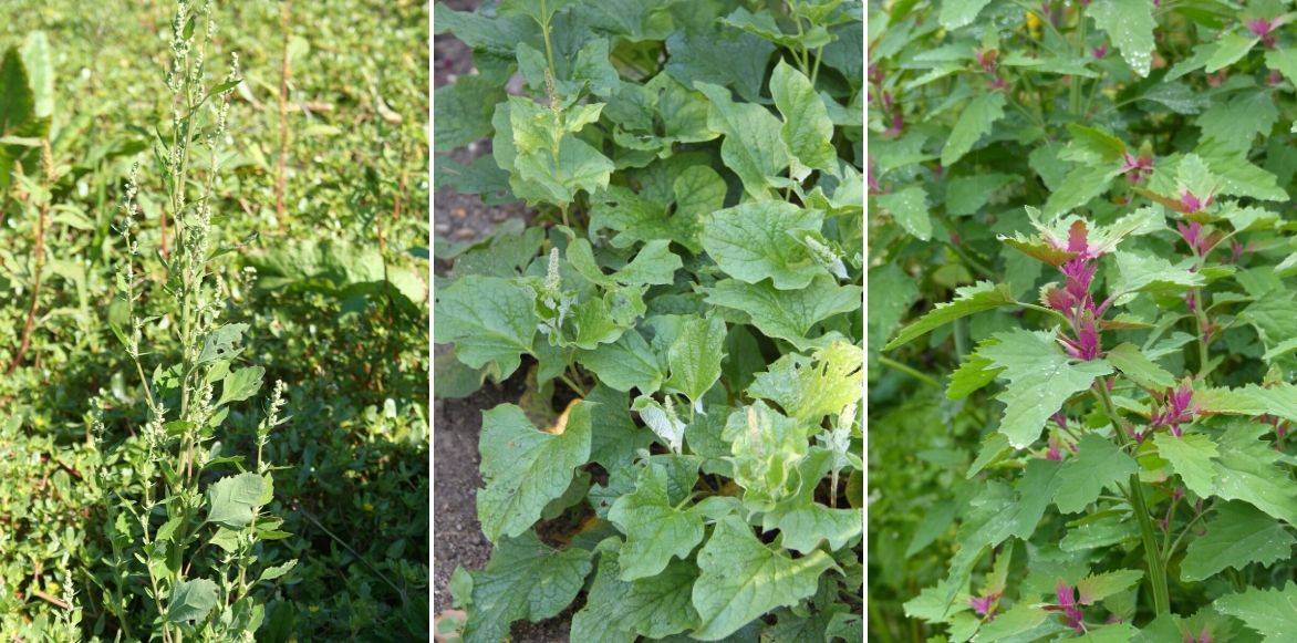 - le Chénopode blanc (Chenopodium album) qui est une espèce annuelle invasive, considérée comme une mauvaise herbe, véritable peste au jardin, car elle colonise les cultures fertilisées et les terres fréquemment travaillées de nos potagers par exemple, ou sur les tas de fumier ou de compost