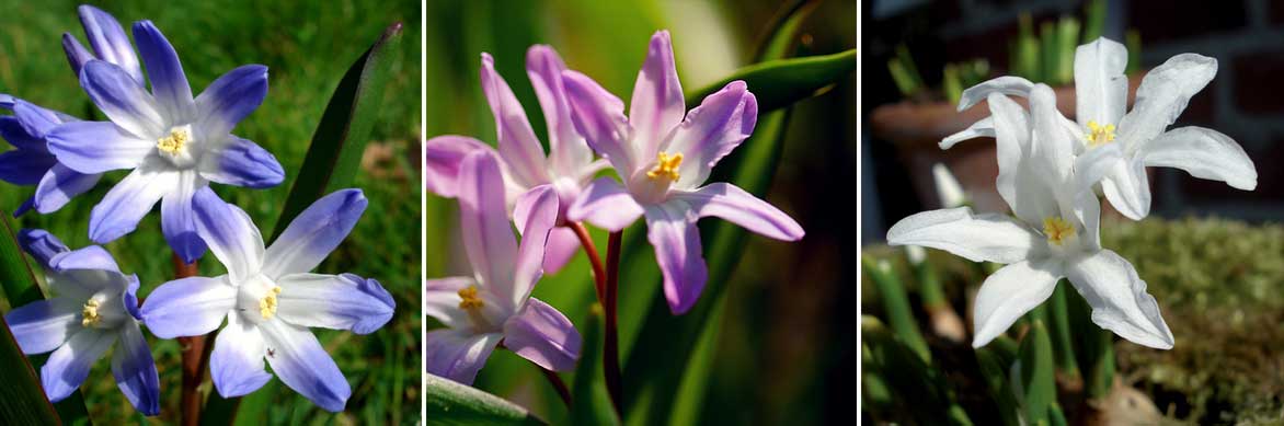 Les fleurs de chionodoxa peuvent prendre différentes teintes. Chionodoxa luciliae, Chionodoxa forbesii ‘Pink Giant’ (photo Steven Bemelman – iBulb) et Chionodoxa luciliae ‘Alba’