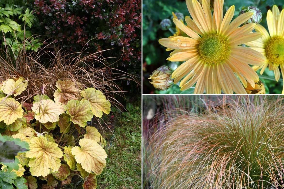 Une idée d’assocation épicée : Chrysanthemum rubellum ‘Mary Stocker’, Berberis thunbergii ‘Atropurpurea Nana’, Carex comans ‘Bronze Form’, Carex testacea ‘Prairie Fire’ et heuchère orangée comme la variété ‘Ginger Ale’