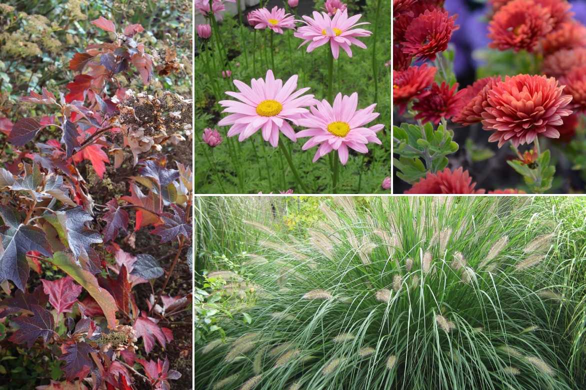 Une idée d’association en massif : Hydrangea quercifolia ‘Burgundy’ (variété approchante ‘Snowflake’), Chrysanthemum rubellum ‘Clara Curtis’, Chrysanthemum rouge (variété approchante ‘Duchess of Edinburgh’), Pennisetum alopecuroïdes f. viridescens (ou encore ‘Red Button’)
