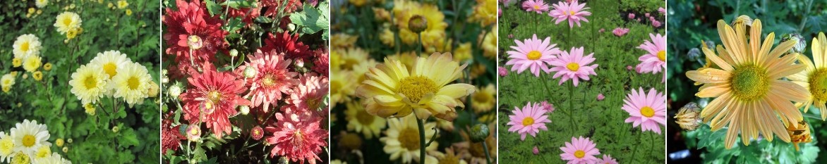 Fleurs de Chrysanthèmes : Chrysanthemum indicum ‘Poesie’, Chrysanthemum rubellum ‘Duchess of Edinburgh’, Chrysanthemum indicum ‘Dernier Soleil’, Chrysanthemum rubellum ‘Clara Curtis’, Chrysanthemum rubellum ‘Mary Stocker’