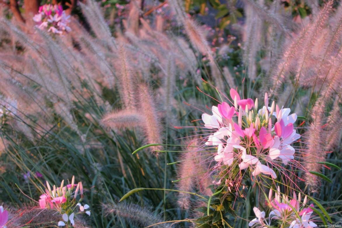 Les fleurs de la cléome, d’une grande légèreté, s’associent bien avec des graminées comme les pennisetums ou les grands cultivars de Miscanthus.