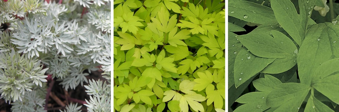 Le feuillage de certaines variétés est aussi intéressant que la floraison. Si celui, de D. spectabilis est magnifique et luxuriant, les variétés rampantes, Dicentra formosa et D. eximia possèdent de jolies feuilles découpées très décoratives. Finement découpé, léger, élégant, leur feuillage évoque celui de la fougère ou du cerfeuil.